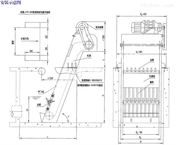 按水流方向耙齒鏈類同于格柵,在耙齒鏈軸上裝配的耙齒間隙可以根據(jù)使用條件進行選擇。當耙齒把流體中的固態(tài)懸浮物分離后可以保證水流暢通流過。整個工作過程是連續(xù)的,也可以是間歇的。