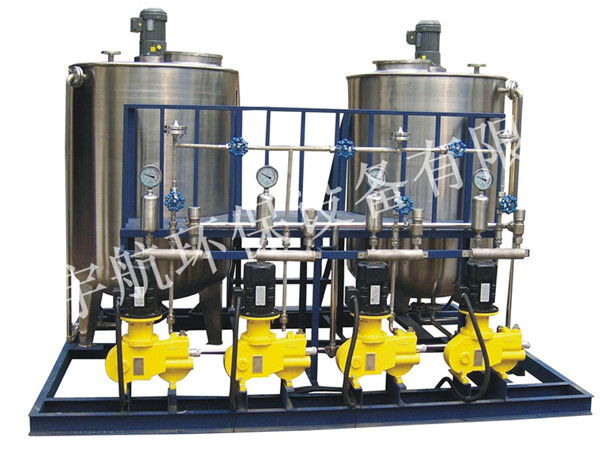 加藥裝置主要由溶液箱、攪拌箱(帶攪拌器)、計量泵、液位計、電控柜、管路、閥門、安全閥、止回閥、壓力表、過濾器、底座、扶梯等組成(可根據(jù)用戶實際要求配置)。